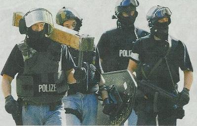 Deutschland hat das amerikanische Beispiel des Einsatzes schwer bewaffneter Hundertschaften gegen unbewaffnete Personen übernommen und erklärt heute auch Personen zu Terroristen, die sich lediglich nicht der politisch verordneten korrekten Meinung anschließen oder deren Ruf man schädigen will. So wurde in Deutschland die Hochzeitsfeier eines jungen Mannes, der den Behörden als Rechtsradikaler galt, mit einer Hundertschaft Polizisten gesprengt. Den bekannten Fußballtrainer Daum erwischte es wegen des Verdachts auf Drogenkonsum. Im Oktober 2000 wurde erst sein Telefon abgehört und dann wurden Haus, Büro und Garten von Dutzenden von Beamten mit großem Aufwand durchsucht. Vor Gericht waren dann V-Männer die Hauptzeugen der Staatsanwaltschaft, und zwar genau die, die Daum vorher die Drogen zum Kauf angeboten hatten. Daum willigte in eine Haarprobe ein und dachte wohl, er hätte nichts zu befürchten. Doch gefehlt, das Ergebnis war positiv. Im Prozess stellte sich dann zwar heraus, dass die Probe wohl im Labor vertauscht worden war, doch da war sein Ruf bereits ruiniert. Hinterhältiges Fallenstellen ist auch in Deutschland ein Charakteristikum des Staates geworden und mehrere Quellen berichten, dass gerade Verfassungsschutzagenten am Drogenverkauf in Deutschland mitwirken.[14]