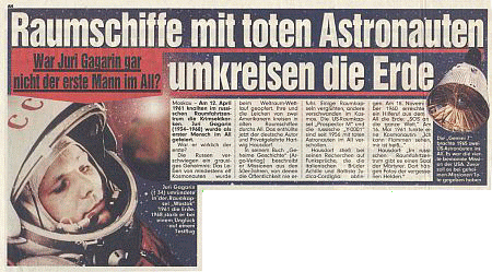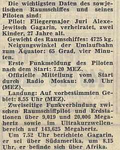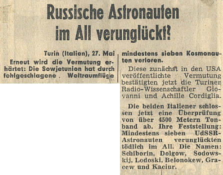 14.10.1961 Eine russisch sprechende männliche Stimme welche abrupt verschwunden war. Kurze Zeit später berichtete das US-Militär von einem verloren gegangen sowjetischen Raumschiff mit einer Besatzung von drei Kosmonauten. Die Übertragung konnte auch in Beobachtungsstationen in Tokio, Dakar, Sydney und der Sternwarte in Bochum gehört werden. Das japanische Institut für Forschung in Tokio meinte, daß Raumschiff wäre in den Weltraum abgetrieben worden.