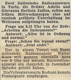 28-30.11.1960 Eine Morse-Nachricht in englischer Sprache mit dem Inhalt "SOS in die ganze Welt". Die Botschaft konnte regelmäßig bis zum 30.11.1960 wiederholt empfangen werden. Es wurde auf dem Signal eine Doppler-Verschiebung festgestellt, welches auf ein sich wegbewegendes Objekt deutete. Die Signale konnten u.a. auch von der Sternwarte in Bochum empfangen werden.