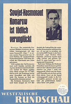 Wohl eine der letzten nachvollziehbaren Beobachtungen der Satellitenbeobachtungsstation "Torre Bert", war der Unglücksflug des Sojus 1 Raumschiffes im April 1967. Kosmonaut Wladimir Komarow der im Oktober 1964 schon einen 1-tägigen Raumflug mit Woschod 1 erfolgreich absolviert hatte, durfte mit diesem neuen Prototypen von einem Raumschiff, den ersten bemannten Testflug durchführen. Schon kurz nach dem Erreichen der Umlaufbahn stellten sich die ersten Probleme ein. Die Mission konnte nicht wie geplant durchgeführt werden. Nach 18 Umläufen wurde daher vorzeitig die Landung eingeleitet, wo es zu einem folgenschweren Unfall kam. Da sich der Hauptfallschirm nicht entfalten lies, schlug die Kapsel fast ungebremst auf den Boden auf, wobei Kosmonaut Wladimir Komarow sein Leben verlor. Nach den Angaben bei Wikipedia: Sojus 1, soll der Kurzwellensender von Sojus 1 nicht fehlerfrei funktioniert haben. Somit war nur eine sichere Kommunikation über VHF und direkt über dem sowjetischen Territorium möglich. M.D.Oslender sowie auch die Sternwarte in Bochum konnten aber z.B. noch vor dem Funk-Blackout bis 04:15 Uhr MEZ, nur ganze 9 Minuten vor der harten Landung, auf 20.008 kHz in AM letzte Funksprüche "Alles in Ordnung! Ich fühle mich wohl." von Wladimir Komarow empfangen. Interessant ist da die scheinbar Gegensätzliche Darstellungsweise von den Brüdern Judica-Cordiglia, welche in der Tageszeitung Mittag vom 25.04.1967 abgedruckt worden ist. Da hatte Wladimir Komarow doch nicht so einen frischen und gelösten Eindruck vor der Landung gemacht, wie es wiederum von der Sternwarte in Bochum berichtet, im Extrablatt der Westfälischen Rundschau vom 24.04.1967 geschrieben steht. (siehe auch: Berliner Zeitung vom 24.04.1967 Komarows Stimmer im "Ohr" )