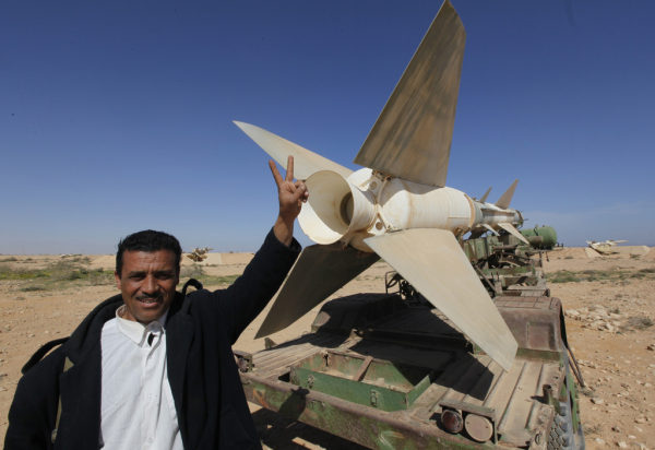 Ein Mann posiert am 23. Februar vor libyschem Kriegsmaterial in der Nähe der gefallenen Stadt Tobruk.