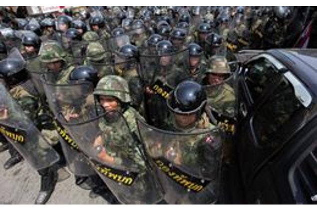 In der Innenstadt riegelten Polizisten Zufahrtstrassen zu dem Geschäftsviertel ab, das die nach ihrer Protest-Farbe benannten Rothemden seit einer Woche besetzt halten. Teilnehmer verteilten nasse Handtücher, um sich für einen erwarteten Tränengasangriff zu wappnen. Von dem Armeestützpunkt aus rückten mindestens 20 Panzerwagen und tausende Soldaten auf die Phan- Fa-Brücke vor, wo die Demonstranten seit vier Wochen kampieren.