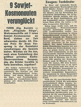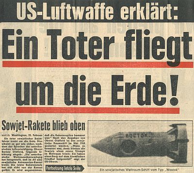 14.10.1961 Eine russisch sprechende männliche Stimme welche abrupt verschwunden war. Kurze Zeit später berichtete das US-Militär von einem verloren gegangen sowjetischen Raumschiff mit einer Besatzung von drei Kosmonauten. Die Übertragung konnte auch in Beobachtungsstationen in Tokio, Dakar, Sydney und der Sternwarte in Bochum gehört werden. Das japanische Institut für Forschung in Tokio meinte, daß Raumschiff wäre in den Weltraum abgetrieben worden.
