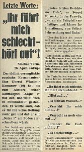 Wohl eine der letzten nachvollziehbaren Beobachtungen der Satellitenbeobachtungsstation "Torre Bert", war der Unglücksflug des Sojus 1 Raumschiffes im April 1967. Kosmonaut Wladimir Komarow der im Oktober 1964 schon einen 1-tägigen Raumflug mit Woschod 1 erfolgreich absolviert hatte, durfte mit diesem neuen Prototypen von einem Raumschiff, den ersten bemannten Testflug durchführen. Schon kurz nach dem Erreichen der Umlaufbahn stellten sich die ersten Probleme ein. Die Mission konnte nicht wie geplant durchgeführt werden. Nach 18 Umläufen wurde daher vorzeitig die Landung eingeleitet, wo es zu einem folgenschweren Unfall kam. Da sich der Hauptfallschirm nicht entfalten lies, schlug die Kapsel fast ungebremst auf den Boden auf, wobei Kosmonaut Wladimir Komarow sein Leben verlor. Nach den Angaben bei Wikipedia: Sojus 1, soll der Kurzwellensender von Sojus 1 nicht fehlerfrei funktioniert haben. Somit war nur eine sichere Kommunikation über VHF und direkt über dem sowjetischen Territorium möglich. M.D.Oslender sowie auch die Sternwarte in Bochum konnten aber z.B. noch vor dem Funk-Blackout bis 04:15 Uhr MEZ, nur ganze 9 Minuten vor der harten Landung, auf 20.008 kHz in AM letzte Funksprüche "Alles in Ordnung! Ich fühle mich wohl." von Wladimir Komarow empfangen. Interessant ist da die scheinbar Gegensätzliche Darstellungsweise von den Brüdern Judica-Cordiglia, welche in der Tageszeitung Mittag vom 25.04.1967 abgedruckt worden ist. Da hatte Wladimir Komarow doch nicht so einen frischen und gelösten Eindruck vor der Landung gemacht, wie es wiederum von der Sternwarte in Bochum berichtet, im Extrablatt der Westfälischen Rundschau vom 24.04.1967 geschrieben steht. (siehe auch: Berliner Zeitung vom 24.04.1967 Komarows Stimmer im "Ohr" )