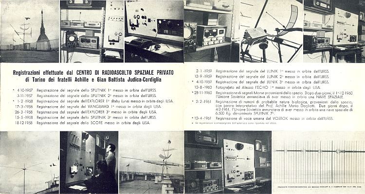Schon ab dem Jahr 1949 begann das Interesse an der Radiotechnik bei den Brüdern Achille damals 16 Jahre und Giovanni Battista damals erst 10 Jahre alt. Durch ein Geschenk von einem Freund der Familie bekamen sie die Anregung zu diesem Hobby. Sie wohnten zu dieser Zeit im kleinen Städtchen Erba nahe dem Comersee in Italien. Als die US-Besatzungsarmee eines Tages überflüssige Funkausrüstung zum Flohmarktpreis verkaufte, bauten sich die Brüder Judica-Cordiglia ihre erste Funkanlage in der Dachkammer des Elternhauses zusammen. Schritt für Schritt erweiterten sie ihre Funkanlage mit mehreren Empfängern, um gleichzeitig mehr als nur eine Frequenz hören zu können, in dem sie Geräte aus zweite oder dritte Hand erwarben. Ihre Antennen bauten sich die Brüder Judica-Cordiglia um Geld zu sparen, seit Anfang an selber. Schließlich wurden sie vom Satellitenzeitalter fasziniert und entschieden sich ein Teil von ihm zu werden. Sie beschlossen sich damals mehr auf die sowjetische Raumfahrt zu konzentrieren, weil die Sowjetunion näher an Italien lag und sie im Gegensatz zu den USA, allgemein nur sehr wenige Details über ihr Raumfahrtprogramm veröffentlicht haben. Dazu kam das die Sowjetunion keine genauen Angaben über ihre bevor stehenden Starts gemacht hatte und sie immer nur davon berichtet haben, wenn die Mission bereits im vollem Gange war. Der erste Erfolg der Brüder Judica-Cordiglia war der Empfang des Sputnik 1 im Oktober 1957, nach stundenlangen Wartens vor dem Empfänger. Weiter ging es im November 1957, wo sie von Sputnik 2 mit dem ersten Lebewesen im Weltrum der Hündin Laika, nicht nur die Messwertübertragung des Satelliten, sondern auch den Herzschlag auf einer anderen Frequenz hören konnten. In den folgenden Jahren wurde mit einem außerordentlichen Scharfsinn der Brüder Judica-Cordiglia, alles abgehört und aufgezeichnet, was es an sowjetischen und amerikanischen Satelliten erfolgreich in eine Umlaufbahn geschafft hatte.