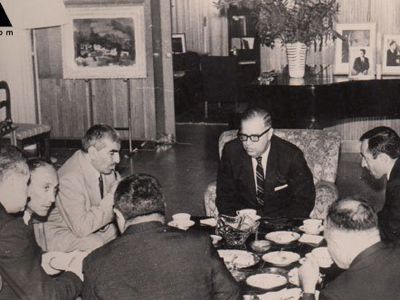 In den 1960er Jahren näherte sich Mullah Mustafa Barzani (der Vater von Massoud Barzani) Washington und dem Schah von Persien. Er wurde Offizier des israelischen Geheimdienstes Mossad. Man sieht ihn hier in Israel mit Abba Eban (Minister für auswärtige Angelegenheiten) und mit General Meir Amit (Leiter des israelischen Geheimdienstes Mossad).